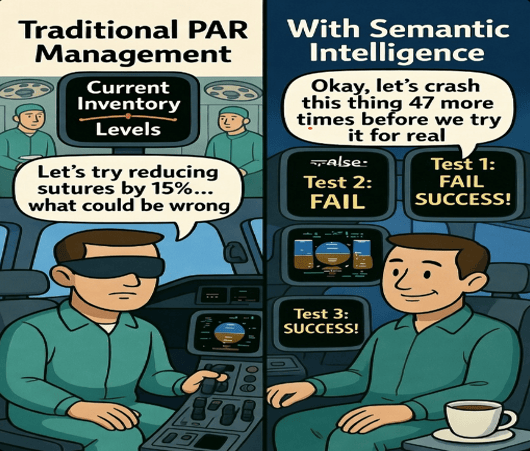 Semantic intelligence for PAR management works the same way. It enables strategic planning by modeling the supply chain implications of adding a new service line before you commit. It strengthens vendor negotiations by demonstrating exactly what a 2-day versus 3-day lead time means in operational terms. It supports policy development by testing new protocols like consignment inventory across multiple scenarios. New team members can explore the system and build expertise without learning on the live environment. And perhaps most importantly, it enables continuous improvement through regular 'what if' scenarios that reveal optimization opportunities invisible in current-state data.